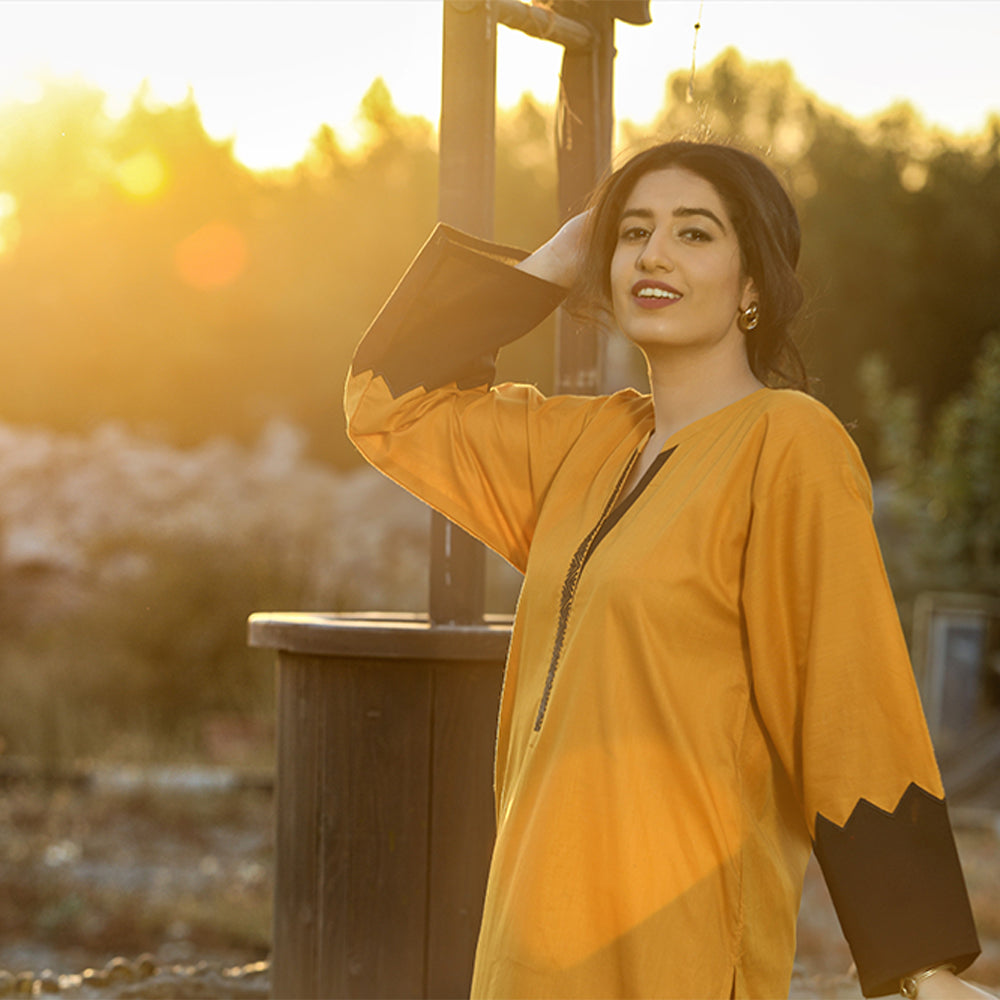 A retro combination of mustard and black. A black zigzag patch on bottom and sleeves makes the whole outfit simple yet trendy.