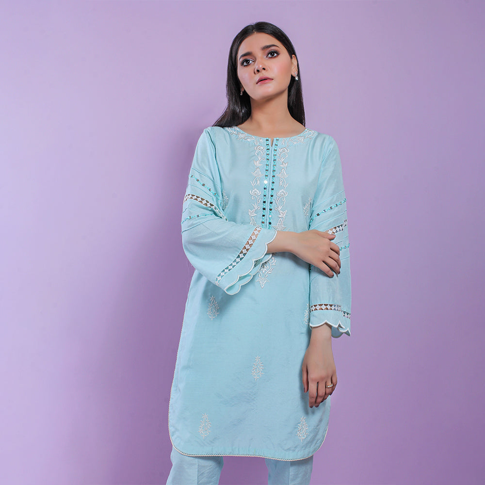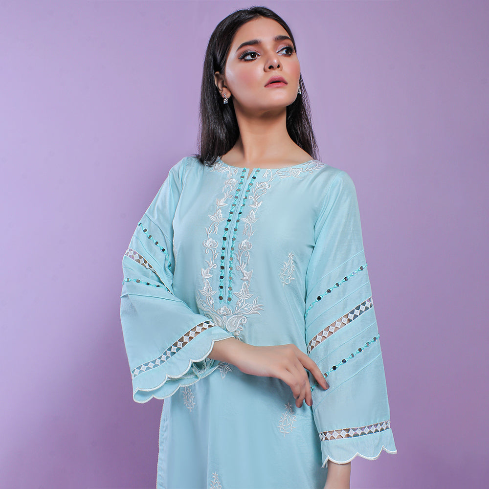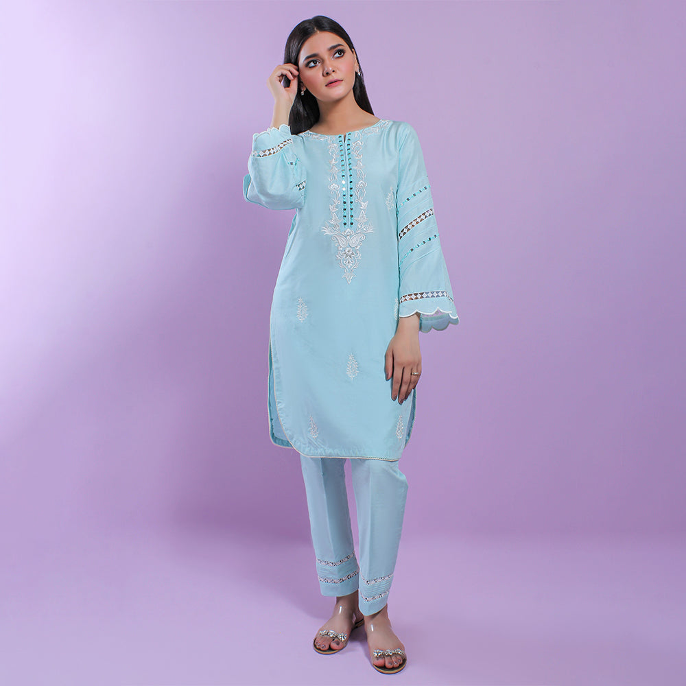 Opt for a classic keepsake embellished with ornamental embroidery and lace inserts on sleeves and trouser.